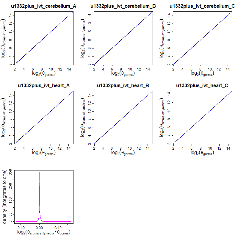 Figure: (Top six panels): Scatter plots comparing the chip-effect estimates (on the log2 scale) from aroma.affymetrix with the ones from gcrma. (Bottom panel): The density of the log2-ratios between aroma.affymetrix and gcrma chip-effect estimates for the six arrays.