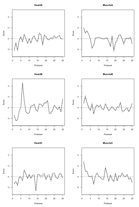 Figure: FIRMA scores for 30 probesets when using RLM (solid) and median polish (dashed) estimators to fit the FIRMA model.