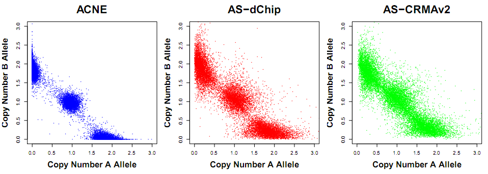 Figure: Allele-specific copy numbers (CA,CB) using ACNE (left), AS-dChip (center) and ASCRMA v2 (right) in a normal region where we know there should be three clouds located around (2,0), (1,1) and (0,2). Data is from an Mapping250K_Nsp data set.
