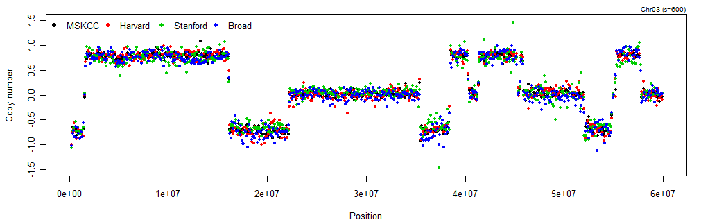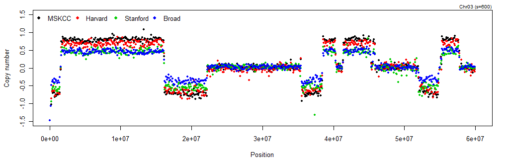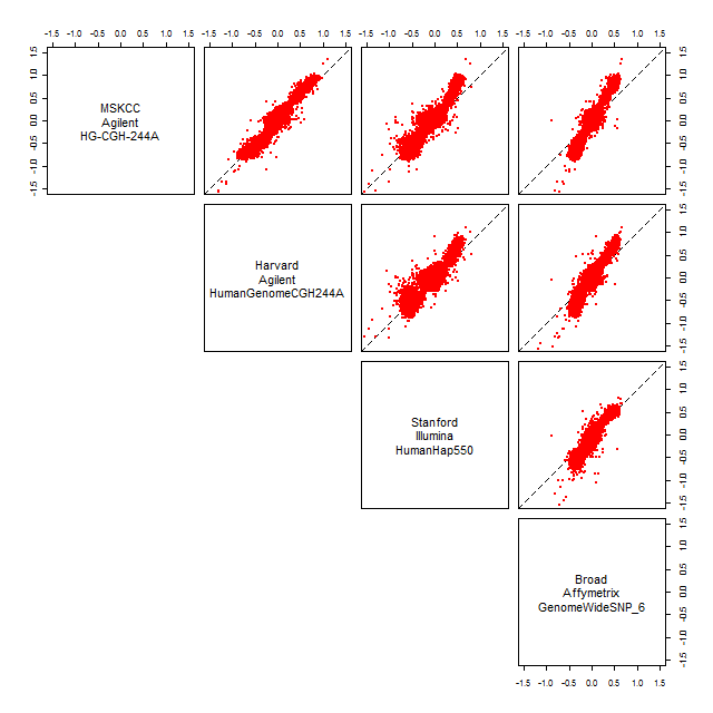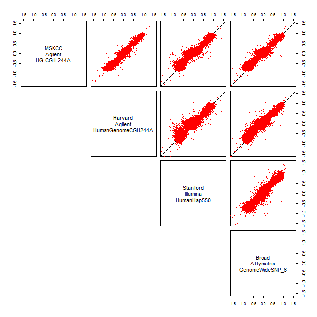 NOTE: Because of possible privacy issues, we are not sure if we can release the small TCGA data set used in this vignette. This is because within the TCGA project it has been decided that data from SNP platforms (Affymetrix and Illumina) cannot be release because the genotype information is available. Here we only use total CNs, but we are still not sure if that is alright. This is the reason why we do not provide a link to download the example data. An alternative is to use a different data set with CN estimates from multiple platforms. Please email HB (see above) with suggestions of other data sets.